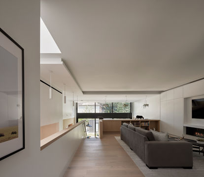 MARS HOUSE showcases an innovative split-level design, anchored by an impressive 18-foot ceiling basketball court, creating a variety of dynamic living spaces. The exterior features engineered structured elements, with the upper storeys strategically set back from the street creating a sense of dimension . The façade is finished with precision, cladded with an unique patterned black metal, complemented by warm wood siding and porcelain slabs, providing a striking balance that is inviting.
